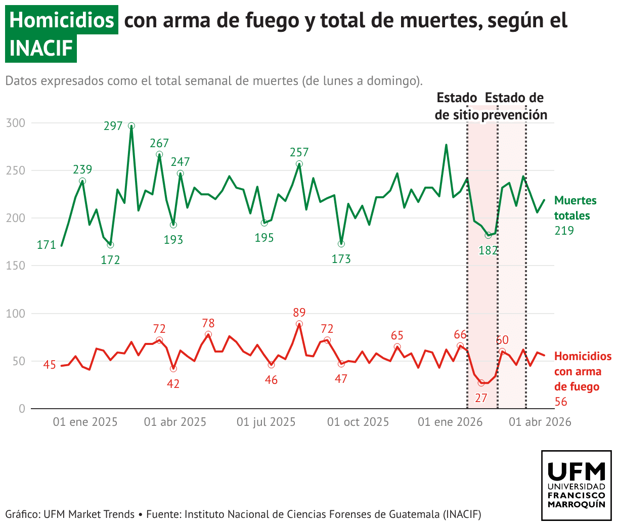 Homicidios con arma de fuego y total de muertes, según el INACIF