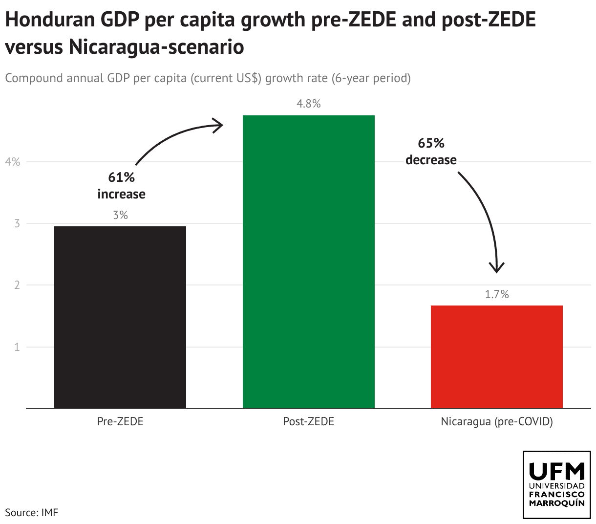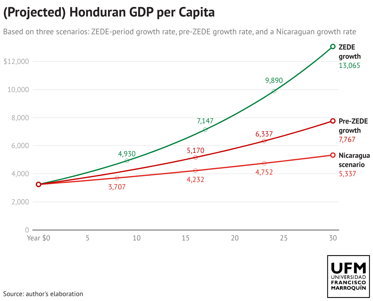 Honduran GDP per capita growth pre-ZEDE and post-ZEDE versus Nicaragua-scenario