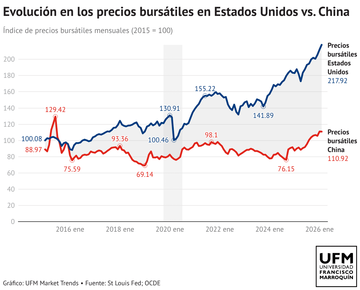 Evolución en los precios bursátiles en Estados Unidos vs. China
