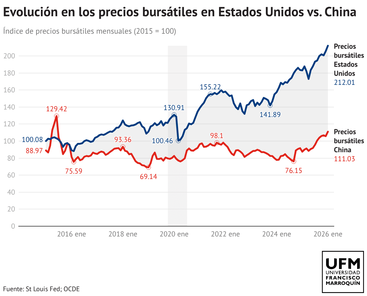 Evolución en los precios bursátiles en Estados Unidos vs. China