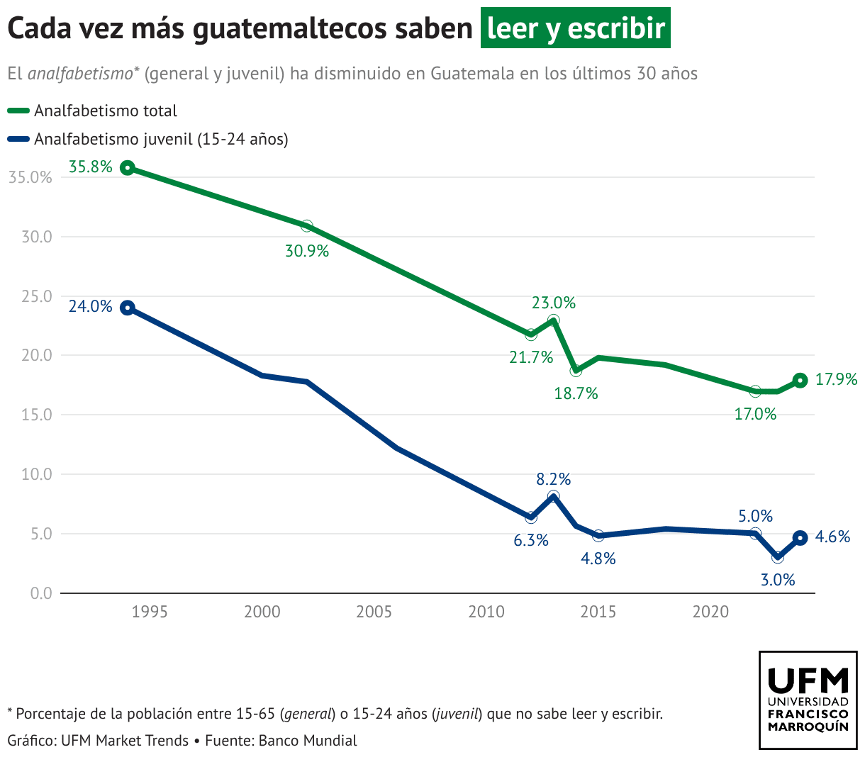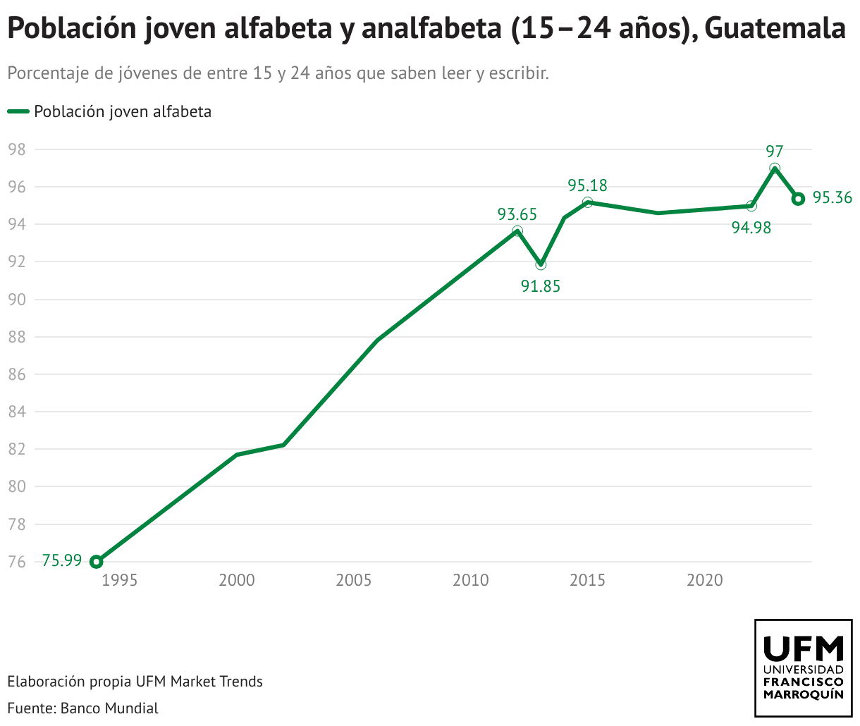 Población joven alfabeta y analfabeta (15–24 años), Guatemala