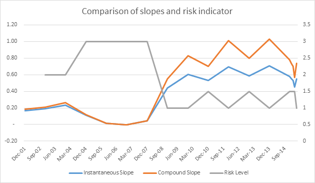 As we can see in figure 1, when the short-term slope is less than the long-term slope it is clear that the interest rate curve is in normal market conditions. The long-term in normal market conditions would imply greater interest rates than those in maturity periods of short-term investments. During crises, the two slopes are equal or tend to be equal, an undeniable sign that the curve is flattening. In figure 2, we clearly see how the risk indicator increases as the slopes equalize and the difference between them is reduced.